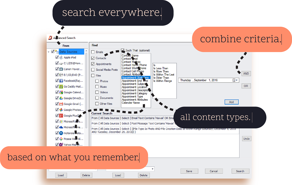 For instance, if you’re organizing an event, you can tag emails, documents, photos, videos and social media posts to be indexed according to the event name. When you want to find a particular email from someone who worked with you on the event, you just search on part of the event name. Bingo! A list of files appears from which you can select the one you want.